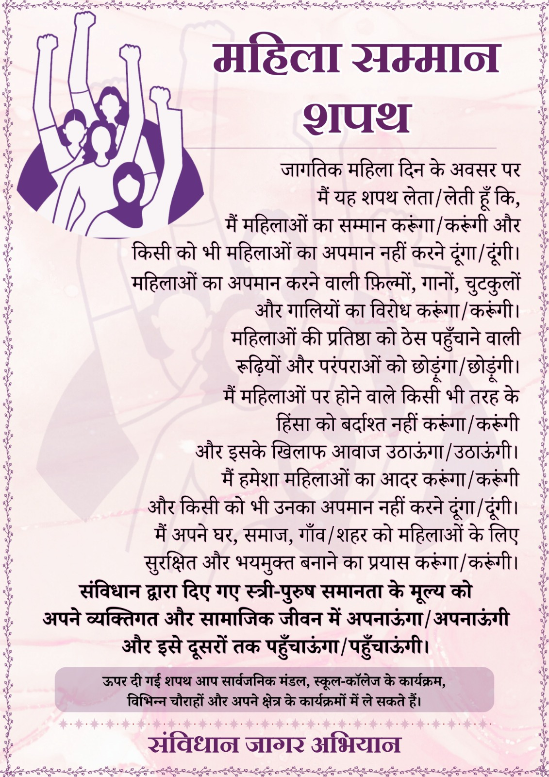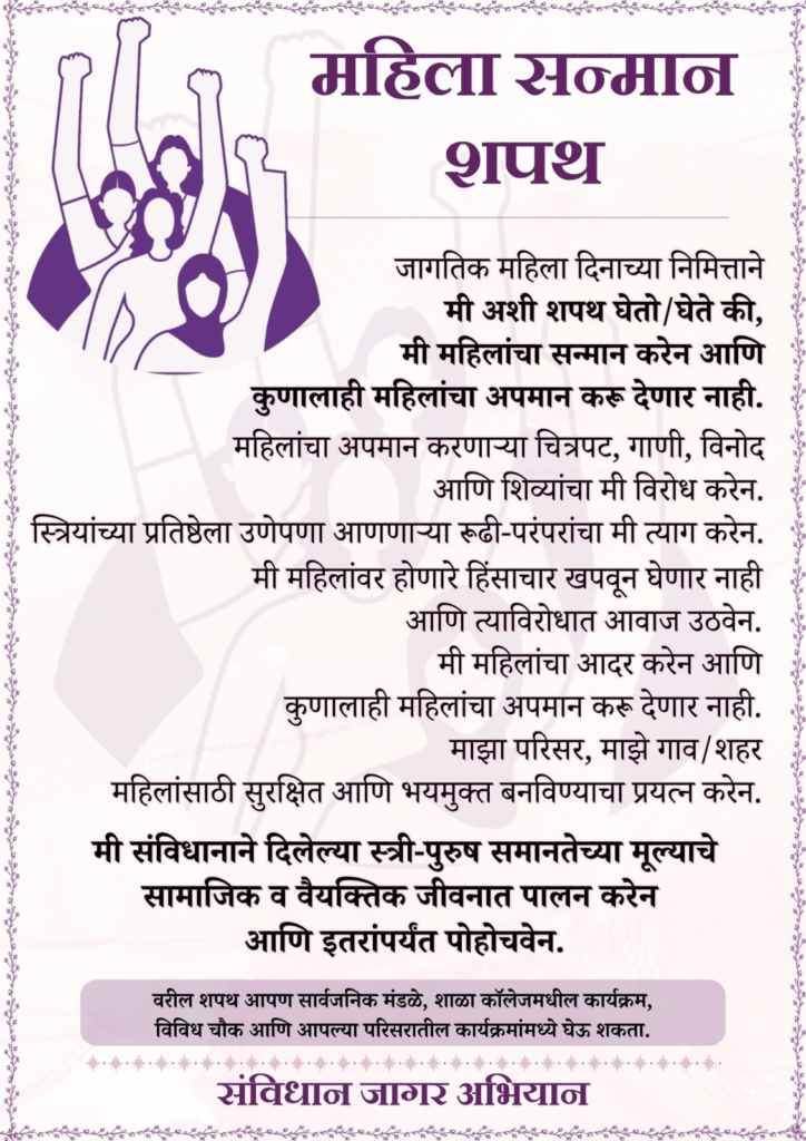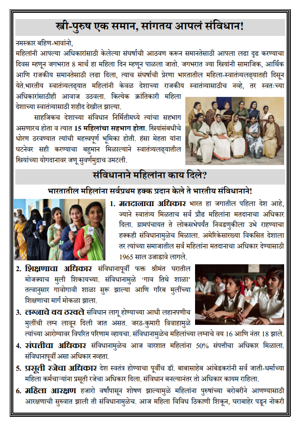 भारतातील महिलांना सर्वप्रथम हक्क प्रदान केले ते भारतीय संविधानाने!समानता, स्वातंत्र्य व सन्मान ही केवळ संविधानातील शब्द नसून स्त्रीच्या जगण्याची मूलभूत तत्त्वे आहेत. संविधानाने महिलांना अधिकार दिले, पण त्यांचा प्रत्यक्ष अनुभव तेव्हाच येईल, जेव्हा समाज म्हणून आपण ते अधिकार मान्य करू, पाळू आणि संरक्षण करू. अन्यायाविरुद्ध आवाज उठवणे, स्त्रीच्या निर्णय स्वातंत्र्याचा सन्मान करणे आणि समानतेसाठी संघटित होणे—हाच संविधानाचा खरा अर्थ आहे. जागतिक महिला दिनानिमित्त खालील उपक्रम राबवू शकता.