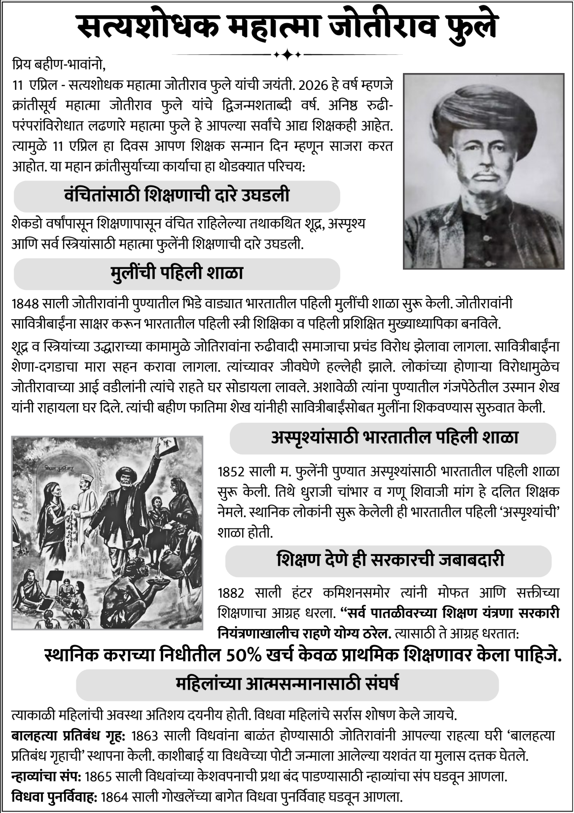 2026 हे वर्ष म्हणजे क्रांतीसूर्य महात्मा जोतीराव फुले जन्म द्विशताब्दी वर्ष आणि भारतीय घटनेचे शिल्पकार डॉ. बाबासाहेब आंबेडकर यांच्या नेतृत्वाखाली झालेल्या महाडच्या ऐतिहासिक चवदार तळे सत्याग्रहाचे शताब्दी वर्ष आहे. महात्मा फुलेंनी आणि बाबासाहेबांनी सामाजिक न्याय आणि समता प्रस्थापित करण्यासाठी आपले जीवन समर्पित केले. कोणत्याही विशेष जातीसाठी नव्हे तर सर्व भारतीयांना माणूस म्हणून प्रतिष्ठेने जगता यावे यासाठी त्यांचा संघर्ष होता. आधुनिक भारताच्या जडण-घडणीमध्ये या महामानवांचे अमूल्य योगदान आहे. याची जाणीव घरोघरी पोहोचवण्यासाठी आपण विविध उपक्रम राबवूयात.
