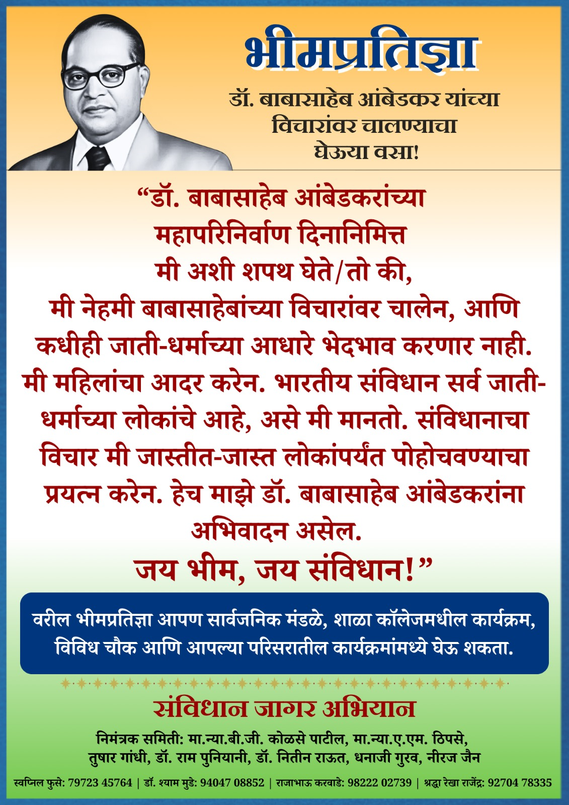 डॉ. बाबासाहेब आंबेडकरांच्या जयंतीनिमित्त त्यांच्या मार्गावर चालण्याचा वसा घेणारी प्रतिज्ञा ठिकठिकाणी कार्यक्रमात घेऊया.